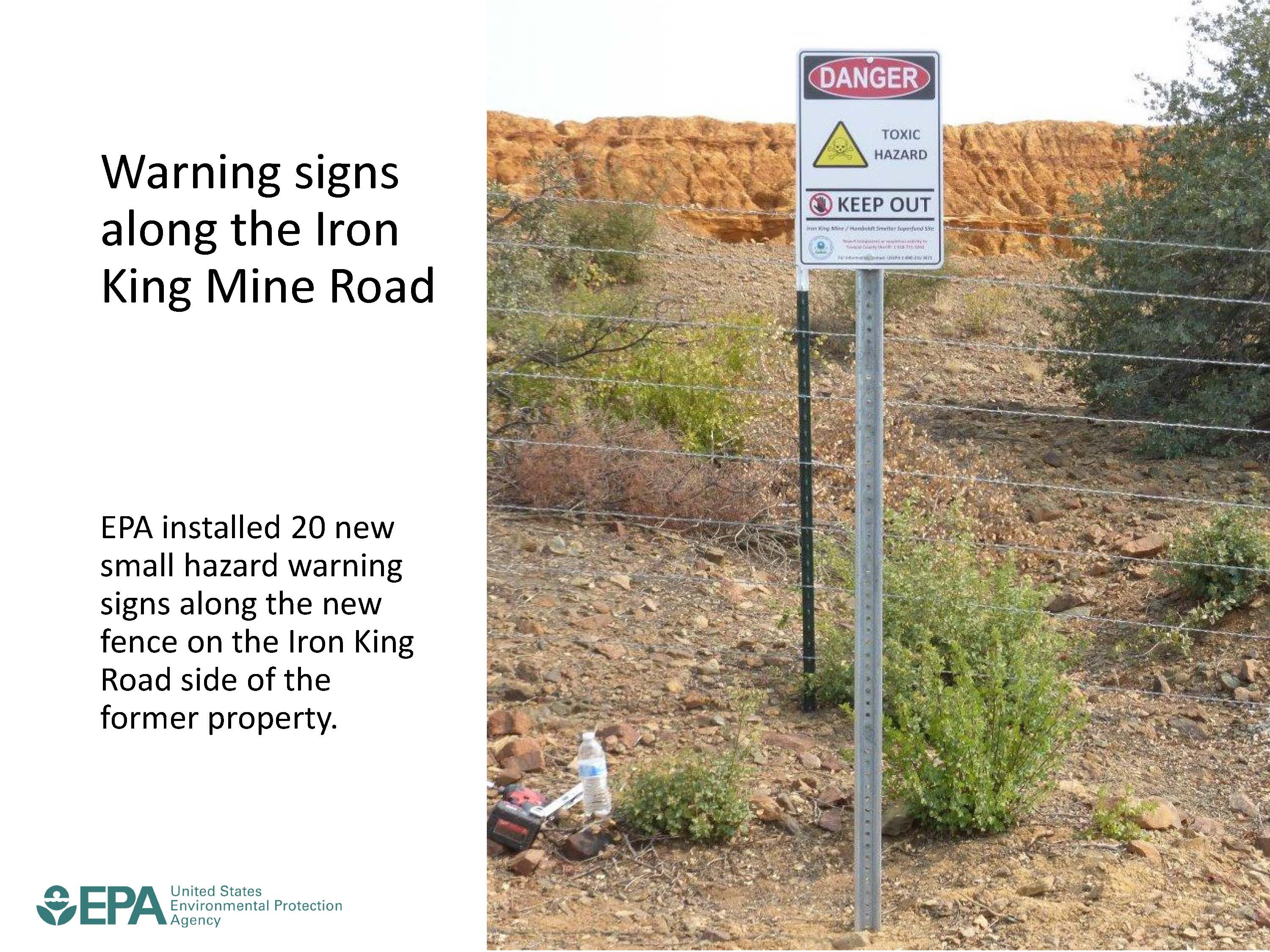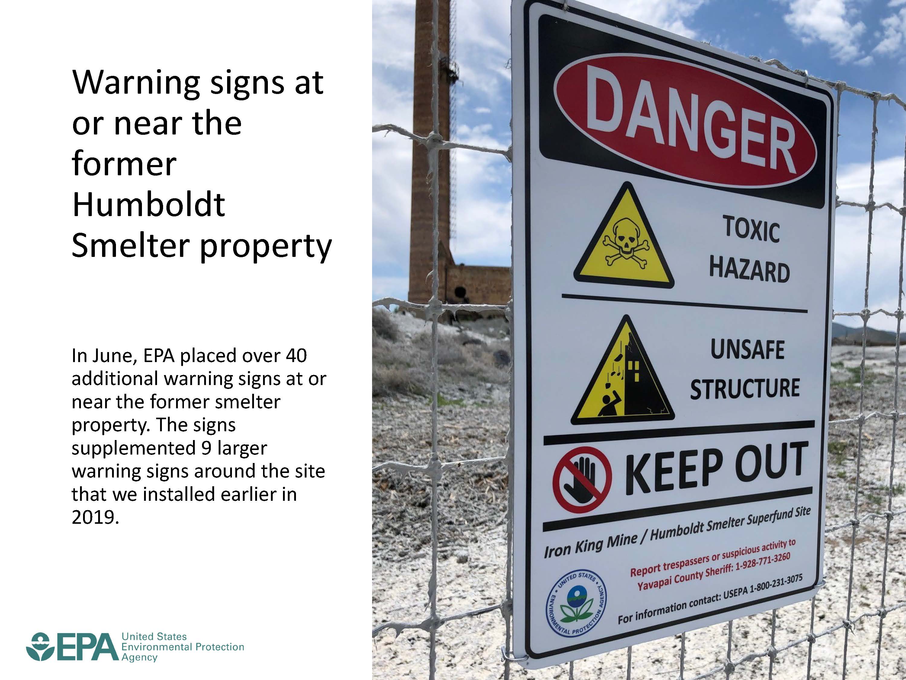 In late 2019, the U.S. Environmental Protection Agency (EPA) placed fencing at the former Humboldt Smelter property to limit public access. EPA continues to work with the owner of the former Iron King Mine property to upgrade and add fencing. We ask the public to follow warning signs and stay away from the mine and smelter properties.