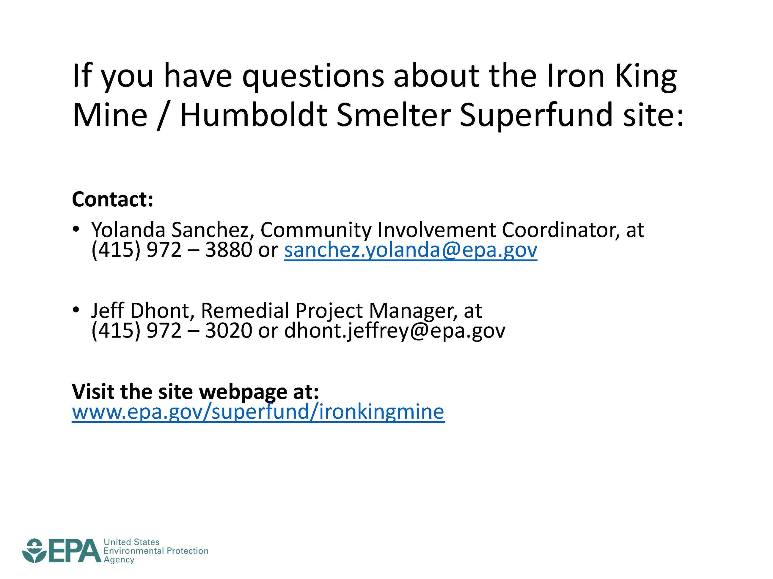 Please contact EPA with any questions using the contacts on our site webpage: www.epa.gov/superfund/ironkingmine